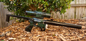 This time, I went for a different camo look, using a technique that I will do a guide on how to do at a later date. This turned out really nice, and it's probably my most powerful Nerf gun I have at the moment, hitting 100 feet or more. It's because of this that I added the faux barrel back on, because it slows down reload time to make it a little more fair and challenging to use in a Nerf war, and also because the wide aperture barrel helps reduce the flailing that streamline darts do sometimes without having much impact on range.